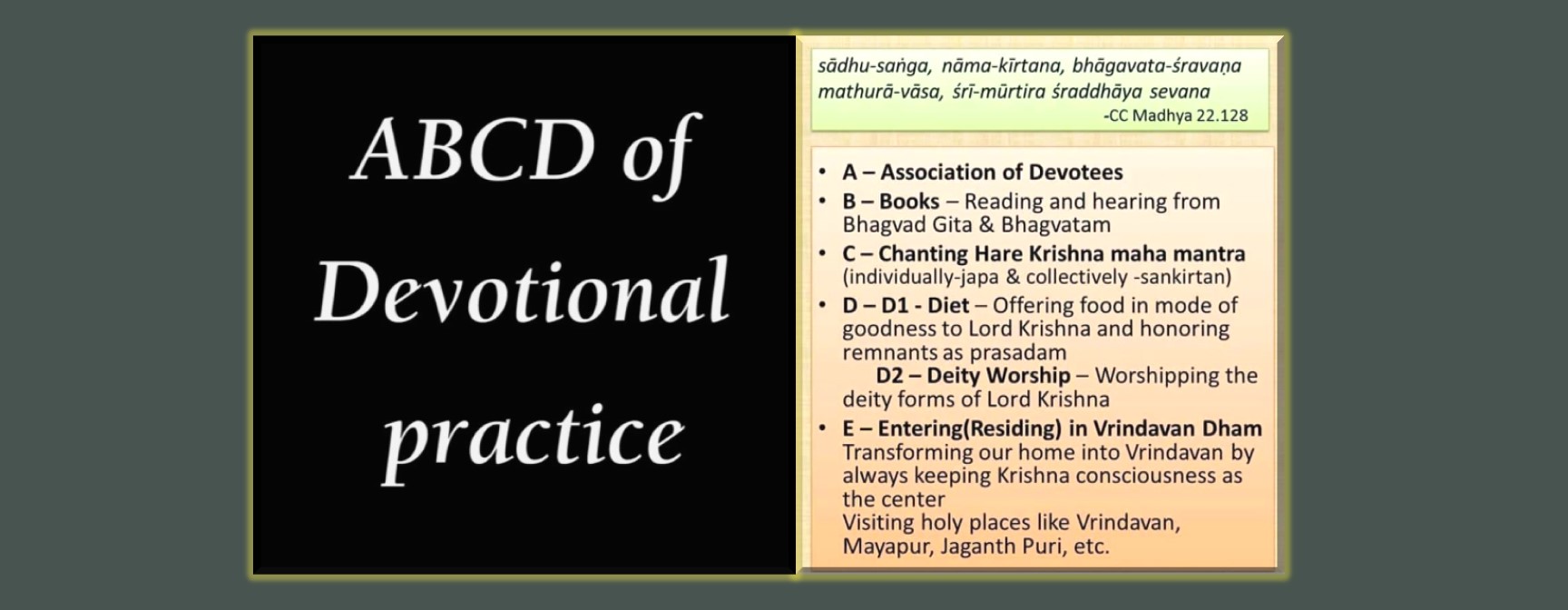 In the philosophy of Bhakti Yoga (devotional service), the Absolute Truth is known as a person. His name is Krishna, a Sanskrit word which means “all attractive”. Without loving someone and being loved by someone, life is very empty and superficial. The origin of that love is the soul’s love for God and God’s love for the soul. We are attracted by someone who is beautiful, someone who is powerful, someone who is learned, someone who is famous, someone who is renounced, and someone who has wealth. These are opulences that attract our heart. The name –Krishna, means that he possesses all opulences in full. He is the source all beauty, all strength, all knowledge, all wealth, all fame, and all renunciation. And Krishna’s love for the soul is unlimited and unconditional. We could feel Krishna through the path of bhakti. Bhakti is the easiest process God has given us through which we could think of him all day, every day. Krishna resides within the hearts of every living being. Bhakti Yoga means to be reunited with our source, with God, through acts of devotion—by remembering about him, by chanting his names and singing his glories, by praying to him, by worshiping, by rendering service to him, to his devotees and to all living beings. These are ways by which we could always experience the presence of Krishna.