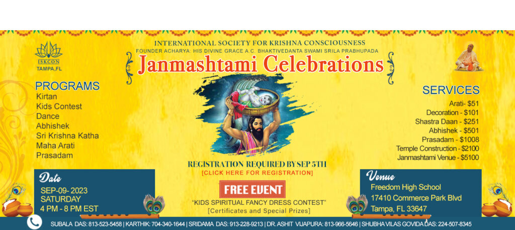 Join us to celebrate "Sri Krishna Janmashtami - The Appearance Day of Lord Sri Krishna" @ Freedom High School (Auditorium) located at 17410 Commerce Park Blvd, Tampa, FL 33647
