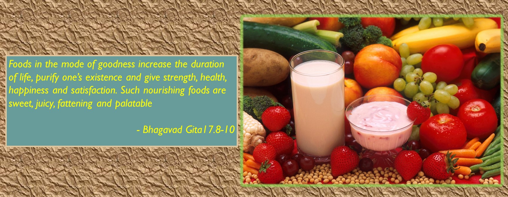 The Vedic scriptures establish nonviolence, called ahimsa, as the ethical foundation of vegetarianism and for a peaceful society. According to the Vedas, God is the Supreme Father of all creatures, not just humans. Therefore, slaughter of innocent animals is considered equivalent to killing one’s brother or sister. Krishna devotees follow a wholesome lacto-vegetarian diet excluding meat, fish and eggs. Although it may be argued that vegetarians are guilty of killing vegetables, foods such as fruits, nuts, milk, and grains do not require killing. But even when a plant’s life is taken, the pain involved is dramatically less than that of a highly-sensitive animal such as a cow or lamb. According to karma, nature’s law of action and reaction, human beings must suffer for any killing that is against God’s laws. For this reason, as well as to show recognition and appreciation for the supreme proprietor and supplier of all food, devotees prepare vegetarian meals as devotional offerings to Krishna, God. Then food is called prasadam (spiritual food), which can be fully enjoyed without karmic reaction.
